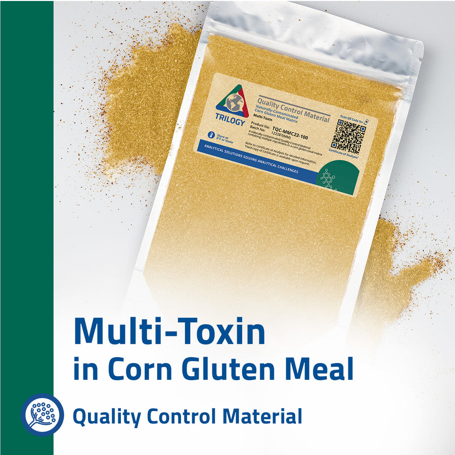 A naturally contaminated Quality Control Material containing Aflatoxin B1/B2/G1/G2, Deoxynivalenol, Fumonisin B1/B2/B3 and Zearalenone in a corn gluten meal matrix and homogenized to a 100% through 30 mesh, 0.595mm consistency. Material packaged in 100g resealable foil packs.
