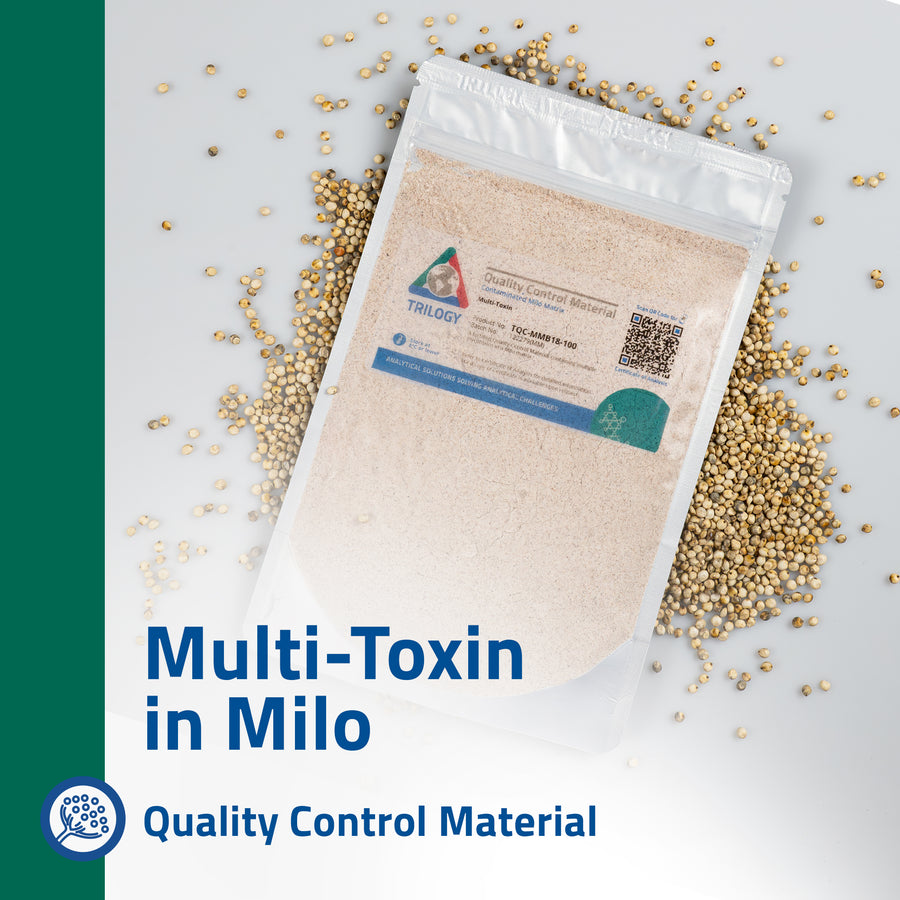 A naturally contaminated Quality Control Material containing T-2 Toxin, HT-2 Toxin and Zearalenone in a milo matrix.